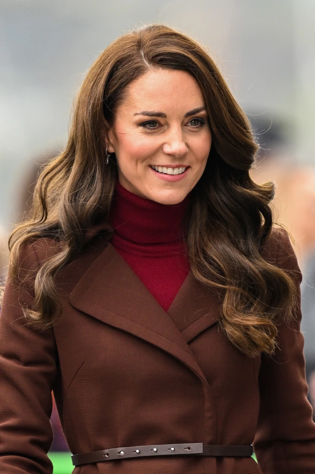 Prințesa de Wales, pur și simplu șic natural, fără mare efort, a apărut cu o ținută spectaculoasă, formată din rochie lungă roșie, palton grena cu curea maro și cizme cu toc din piele întoarsă. Tot ansamblul se potrivea perfect cu castaniul stălucitor al părului său.