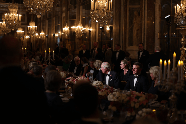 Dineul de stat oferit Regelui Charles al III-lea și Reginei Camilla la Castelul Versailles a fost gândit să reflecte excelența bucătăriei fine dinning, onorând în același timp creativitatea și tradiția gastronomiei franceze. Meniul, a cărui concepere a durat luni de zile, a fost aprobat atât de Palatul Buckingham, cât și de Palatul Élysée, pentru a se potrivi atât cu gusturile și așteptările cuplului regal britanic, precum și cu cele ale perechii prezidențiale Brigitte și Emmanuel Macron.